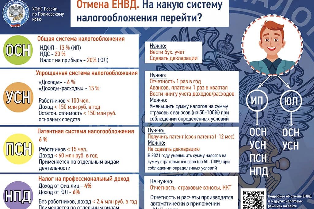 Управление Федеральной налоговой службы по Приморскому краю напоминает, что с 1 января 2021 года система налогообложения в виде единого налога на вмененный доход (ЕНВД) не применяется (Федеральный закон от 29.06.2012 № 97-ФЗ). Чтобы продолжить вести свою деятельность, организациям и индивидуальным предпринимателям, применявшим ЕНВД, необходимо избрать иные режимы налогообложения: