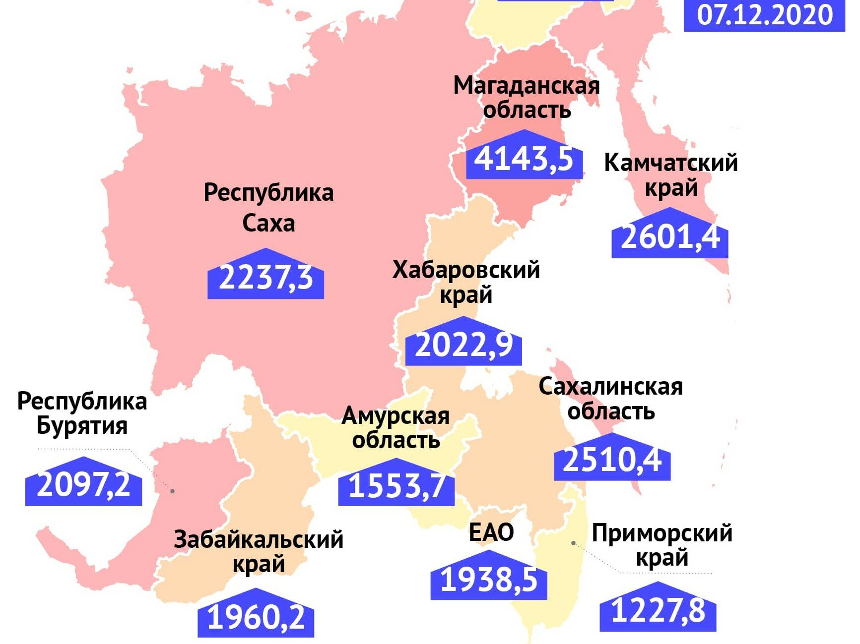 Среди регионов Дальневосточного федерального округа тройку лидеров по численности выявленных инфицированных на 100 тыс. населения составляют Магаданская область (4 143,5 выявленных случаев), Камчатский край (2 601,4) и Сахалинская область (2 510,4). Наименьший показатель у Чукотского автономного округа –845,0.